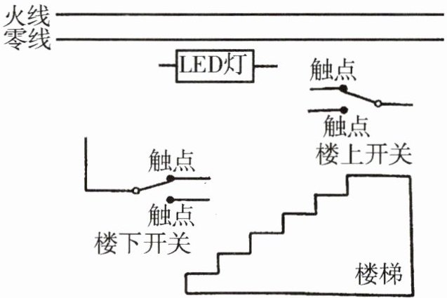 5 小明想用两个单刀双掷开关、一个LED灯和若干导线,设计一个楼梯灯电路,既可以在楼下开灯到楼上关灯,又可以在楼上开灯到楼下关灯,请你根据小明设计的意图,用笔画线代替导线完成题图的电路。