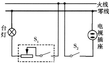 【解析】火线先连接旋钮开关S₁,然后接入台灯,而零线直接接入台灯;开关S₂应与电视插座串联,开关接火线。