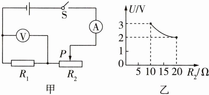 7 [2024淮安中考]如图甲所示,电源电压保持不变$,R_1$为定值电阻,滑动变阻器$R_2$的最大阻值为20Ω。电压表的量程为0~3V,电流表的量程为0~0.6A。在保证电路各元件安全的前提下,电压表的示数随滑动变阻器$R_2$连入电路的阻值变化的关系图像如图乙所示。下列说法中正确的是(