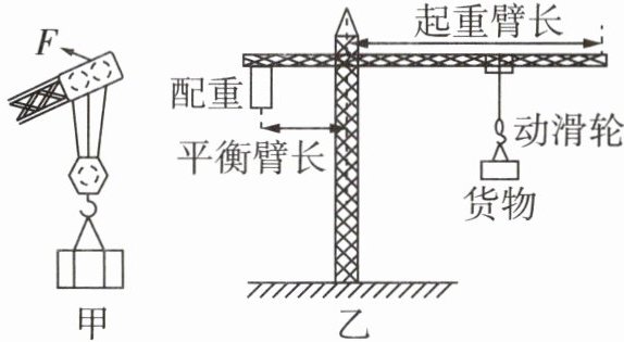 (4)图乙中悬吊货物所用动滑轮与图甲中相同,若配重质量为3t,平衡臂长$L_1= 5m,$起重臂长$L_2= 15m,$当把货物送至最右端且塔臂在水平位置平衡时,求此时货物的质量。(塔臂的重力不计)