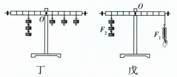 (6) 批判质疑 如图戊所示,小华进行实验时通过弹簧测力计来施加动力,测量并记录了多组数据,分析所测数据后,小华发现,每次实验都是$ F_1 l_1 < F_2 l_2 $,这种情况显然不是误差造成的,经过分析,排除了$ l_1 $、$ F_2 $、$ l_2 $发生测量错误的可能性,那么,为什么每次测出来的动力都偏小呢?
