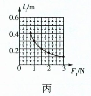 (填“减小误差”或“寻找普遍规律”)。实验中,小明又保持图乙中A点钩码数量和位置不变,在杠杆水平平衡时,测出多组动力臂$ l_1 $和动力 $ F_1 $的数据,绘制了$ l_1 - F_1 $的关系图像,如图丙所示,根据图像推算,当$ l_1 $为0.6m时,$ F_1 $为0.5