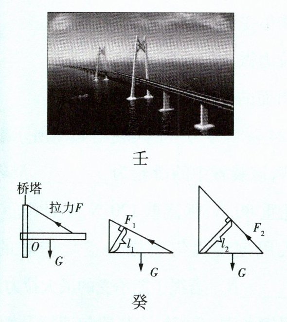 (11) 模型建构 实验结束后小婷对港珠澳大桥(如图壬所示)的结构进行简化,抽象成如图癸所示的杠杆模型,又画了桥塔高低不同的两幅图。通过分析发现:可以通过