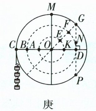 (9) 创新装置 实验中小刚曾提出“力的作用点到支点的距离影响杠杆的平衡”。为判断这一观点是否正确,小敏制作了一个密度均匀的圆盘(相当于杠杆),圆盘可以绕着圆心O转动(转轴阻力忽略不计),如图庚所示。她先在圆盘的C点挂上4个钩码,又在G点挂上一定数量的钩码后,圆盘在图示位置平衡,此时CD水平;接着她将挂在G点的钩码先后挂在