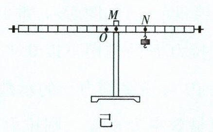 ①将杠杆上的M点挂在支架上,在M点的右侧挂一质量为m的钩码,左右移动钩码的位置使杠杆在水平位置平衡,如图己所示;