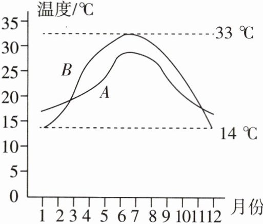 大 大 内陆 【解析】由题图可知,B所示的城市最高、最低气温差比A所示的城市的大;由于沿海城市水较多,水的比热容比砂石大,在相同条件下,在吸收或放出相同的热量时,温度变化较小,所以曲线A表示的是沿海城市的年气温变化曲线,则曲线B表示的是内陆城市的年气温变化曲线。
