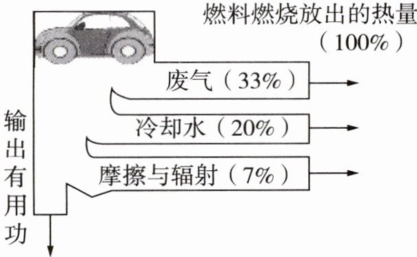 【解析】由图可知,输出的有用功在总能量中所占的比例为100%-33%-20%-7%=40%,所以该内燃机的效率为40%;完全燃烧0.5 kg汽油放出的热量Q总=qm=4.6×10⁷ J/kg×0.5 kg=2.3×10⁷ J,根据η=W有用/Q总×100%可得,该汽车获得的机械能W有用=Q总η=2.3×10⁷ J×40%=9.2×10⁶ J.