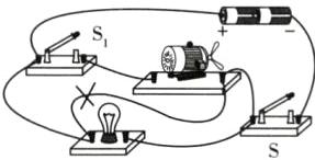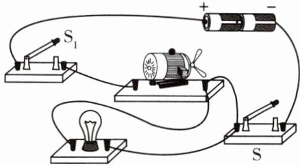 8 在下面的电路中,有一根导线连接错误,请将错误导线用“×”标出,并画出正确连接方式。要求:改正后,灯泡和电动机并联,开关S控制所有用电器,$S_{1}$只控制电动机。