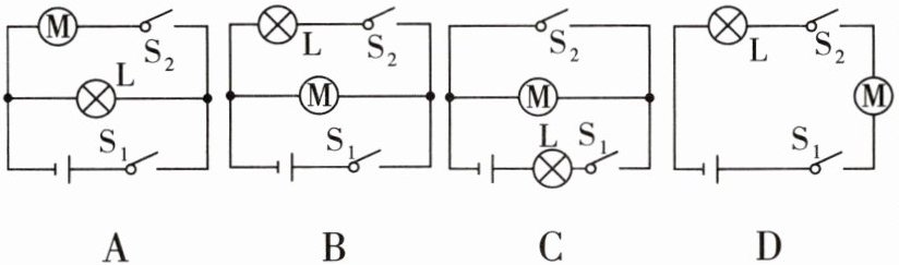 7 [2024南充中考]使用共享单车时,骑行前先要扫码,扫码成功后开关$S_{1}$闭合,指示灯L亮,但电动机不工作;从车头取出头盔并戴上后,头盔内遥控设备遥控$S_{2}$闭合,电动机通电工作;若只戴头盔不扫码则无法骑行。下列电路符合以上设计要求的是(