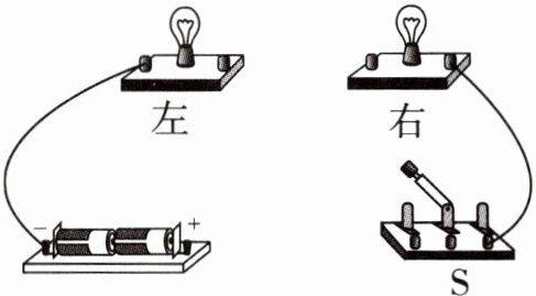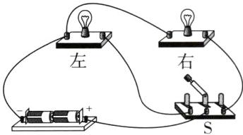9 [2025河池期末]如图左、右两灯分别代表小汽车的左、右转向灯,开关S控制左、右两盏转向灯,且开关往左闭合左灯亮,往右闭合右灯亮。请根据题意用笔画线代替导线完成实物图连接。