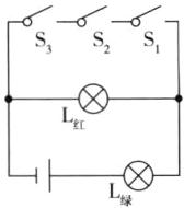 10 [2025安康期末]某保密室有三道门,关上一道门相当于闭合一个开关,只要有一道门没有关上,红灯和绿灯都会发光,当三道门都关上时,红灯会熄灭,只有绿灯会发光。设计出符合要求的电路图画在虚线框内。