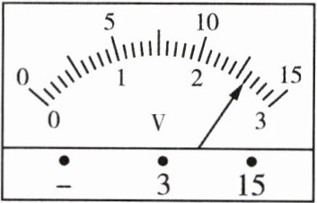 8 小星所连串联电路中,电压表的表盘及指针如图所示,则灯泡$L_2$两端电压为______V。若选用最大测量值为15V的量程,则表盘上每一小格代表______V。