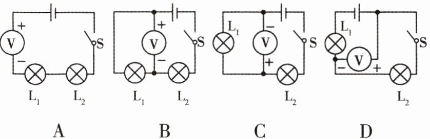 D图→电压表并联在灯L₂的两端→电流从正接线柱流入,从负接线柱流出→D正确。