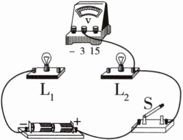 【解析】 用导线将两灯串联,电压表测量灯泡L₂两端电压,则电压表应与灯泡L₂并联,用导线将电压表“-”接线柱和灯泡L₂左接线柱相连。