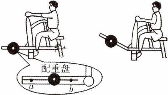 【解析】 用始终与把手垂直的力缓慢向后将把手拉至身体两侧(关键点),动力臂不变,阻力大小等于物体的重力,即阻力不变,由题图可知转动过程中阻力臂会变小,根据杠杆的平衡条件$F_{1}l_{1}=F_{2}l_{2}$知,拉力会变小;若要增加训练强度,应将配重盘向a端移动,增大阻力臂。