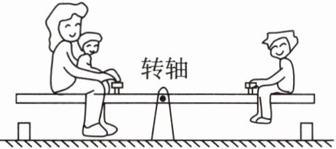 【解析】 题图中跷跷板绕转轴转动,转轴相当于杠杆的支点。跷跷板水平平衡时,设妈妈和妹妹的总重力为$G_{1}$,她们对杠杆的作用力的力臂为$l_{1}$,小涛的重力为$G_{2}$,小涛对杠杆的作用力的力臂为$l_{2}$,由杠杆平衡条件可得$G_{1}l_{1}=G_{2}l_{2}$,已知$G_{1}>G_{2}$,所以$l_{1}<l_{2}$,即小涛比妈妈和妹妹离转轴远一些。若妈妈放下怀抱中的妹妹(妈妈的位置不变),则$G_{1}$减小,$l_{1}$不变,$G_{2}$不变,为了保持跷跷板水平平衡,由杠杆平衡条件可知,应减小$l_{2}$,即小涛应适当靠近转轴。