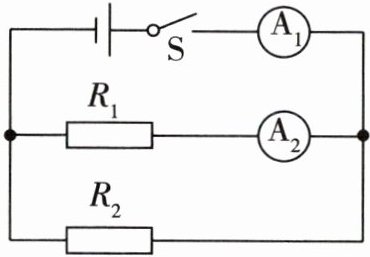 6 [2024 重庆中考 B 卷]将阻值为 10 Ω 的电阻 $ R_1 $ 与另一电阻 $ R_2 $ 接入电源电压恒定的电路中,如图所示。闭合开关 $ S $,电流表 $ A_1 $ 的示数为 0.45 A,电流表 $ A_2 $ 的示数为 0.3 A。求: