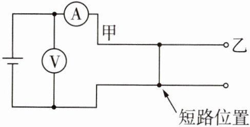 4 [2025合肥瑶海区期中]在相距$10 km$的甲、乙两地之间有两条输电线,已知每$1 m输电线的电阻是0.01 \Omega$。现输电线在某处发生短路,为确定短路位置,检修员利用电压表、电流表和电源接成如图所示电路进行检测,当电压表的示数为$3.0 V$时,电流表示数为$0.1 A$,则甲地到短路位置的输电线的总电阻是