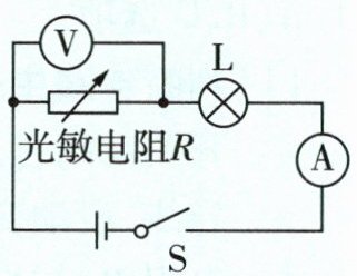 10 [2025宝鸡陈仓区期末]手机在生活中越来越普及。随着科技的进步,有些手机屏幕能随光照强度自动调节亮度,如图所示是它的电路原理图,光敏电阻$R$的阻值随环境光照强度的增大而减小,电源电压不变,开关$S$闭合,当环境光照强度减小时,下列说法正确的是(