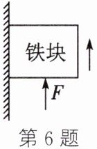 6. 如图所示,铁块重 $ 2 \, \text{N} $,吸附在竖直的磁性黑板上,用竖直向上为 $ 5 \, \text{N} $ 的力 $ F $ 推动铁块,恰能使其匀速向上运动,则铁块与磁性黑板间的滑动摩擦力为 (