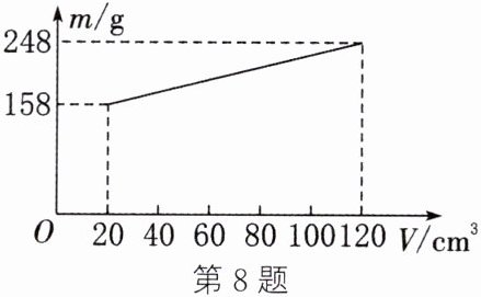 C 解析:设空烧杯的质量为$m_{杯}$,液体的密度为$\rho$,由图可知,当液体体积为$V_{1}=20\ \text{cm}^3$时,液体和烧杯的总质量$m_{\text{总}1}=m_{1}+m_{杯}=158\ \text{g}$,可得$\rho×20\ \text{cm}^3+m_{杯}=158\ \text{g}$ ①;当液体体积为$V_{2}=120\ \text{cm}^3$时,液体和烧杯的总质量$m_{\text{总}2}=m_{2}+m_{杯}=248\ \text{g}$,可得$\rho×120\ \text{cm}^3+m_{杯}=248\ \text{g}$ ②。由①②得,液体的密度$\rho=0.9\ \text{g/cm}^3$,$m_{杯}=140\ \text{g}$。方法点金 巧用量和体积变化量推算 坐标图像中液体体积的增加量对应总质量的变化量,即体积的增加量为$(120-20)\ \text{cm}^3=100\ \text{cm}^3$时,液体质量的变化量就是$(248-158)\ \text{g}=90\ \text{g}$,运用公式$\rho=\frac{m}{V}$计算液体的密度;液体体积为$20\ \text{cm}^3$(或$120\ \text{cm}^3$)时,烧杯和液体的总质量为$158\ \text{g}$(或$248\ \text{g}$),只要用公式$m=\rho V$计算液体的质量,即可知道空烧杯的质量。