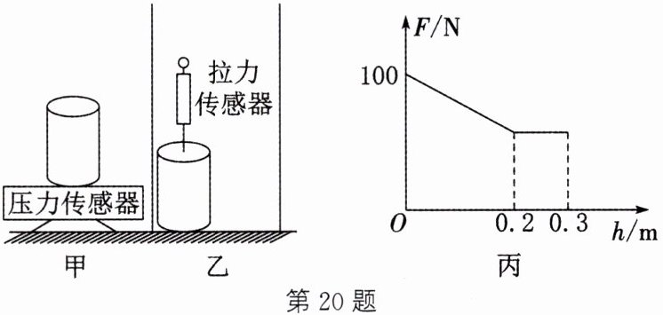 20. (11分)新情境 社会热点 (宿迁中考)科技创新助力中国发展,中国桥梁建设领先世界。小明对桥梁建造产生了浓厚的兴趣,想探究桥墩对河底压力与水深度的关系。他找来底面积为 $ 0.01 \, \text{m}^2 $ 的圆柱体,放在水平地面上的压力传感器上,如图甲所示,压力传感器的示数为 $ 100 \, \text{N} $。考虑到不方便测量圆柱体对河底的压力,于是他将圆柱体挂在拉力传感器下方,缓慢向下放至刚好与容器底部接触,如图乙所示。向容器内加水,记录拉力传感器的示数 $ F $ 和水的深度 $ h $,并画出如图丙所示的图像。求:($ g $ 取 $ 10 \, \text{N/kg} $,$ \rho_{\text{水}} = 1 × 10^3 \, \text{kg/m}^3 $)