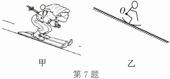 7. 滑雪运动是北京冬奥会比赛项目之一。如图甲所示是一名滑雪运动员沿斜面下滑时的场景,如图乙是其简化图,其中O为滑雪运动员的重心,请你在图乙中画出运动员受到的重力和摩擦力的示意图。