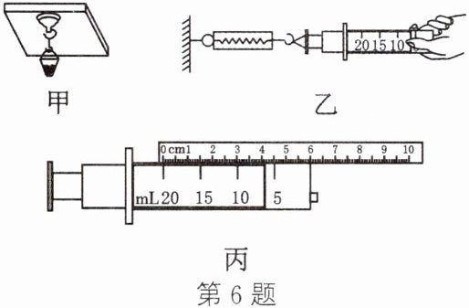 。② 如图乙所示,用细尼龙绳拴住注射器活塞的颈部,使绳的另一端与弹簧测力计的挂钩相连,然后水平向右慢慢拉动注射器筒,当注射器中的活塞刚被拉动时,记下弹簧测力计的示数为29.9N。