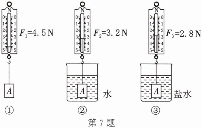 7. (随州中考)实验课上,老师和同学们测量盐水的密度,他们用弹簧测力计、烧杯、水(密度用ρ_水表示)、金属块A、盐水以及不吸水的细线等器材完成了如图所示的实验。