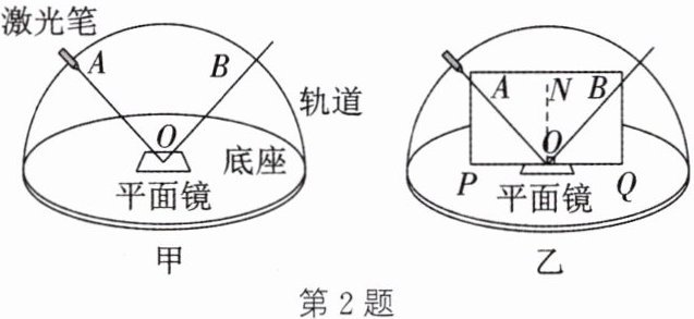 。(2)多次改变激光笔在轨道上的位置,小红调整视角,均能观察到反射光OB挡住入射光AO的现象,如图乙所示,将长方形纸板与AO、OB所在平面重合,其底边PQ紧贴平面镜,在纸板上即可显示出入射光和反射光,多次测量纸板和平面镜的夹角。