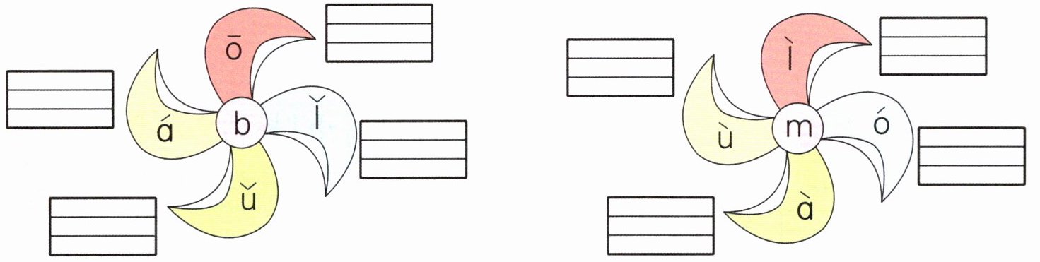 按每个风车“红、蓝、绿、黄”的顺序:bō bǐ bǔ bá mì mó mà mù