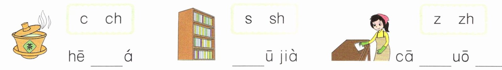 三、根据图片内容,选一选,将音节补全。