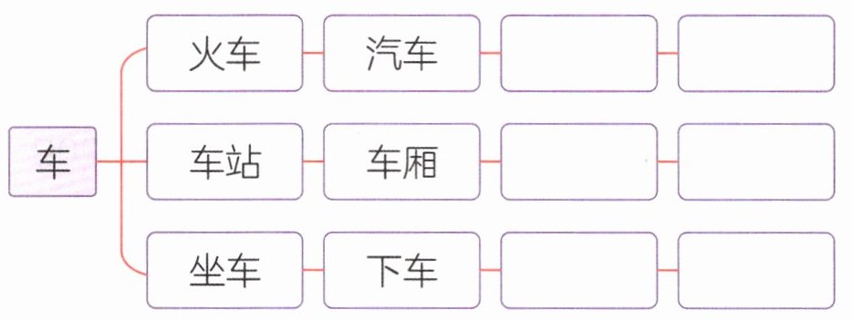 3. ④ ⑤ ① ③ ② ⑥ 解析:选项都是和“车”有关的词语。右侧图中,第一行“火车”“汽车”是车的种类,这类词还有马车、自行车;第二行“车站”“车厢”是有关“车”的名词,这类词还有车牌、车门;第三行“坐车”“下车”是有关“车”的动词,这类词还有开车、上车。