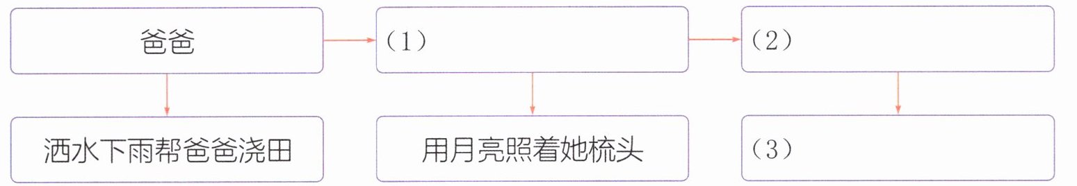 1. 提 走 洒 2.(1)妈妈 (2)哥哥 (3)荡秋千 3. 花裙子 花裙子的美丽 4. 示例:一座通往童话世界的七彩天桥 沿着这座天桥漫步,看看桥那头是否真的有住着小精灵的城堡