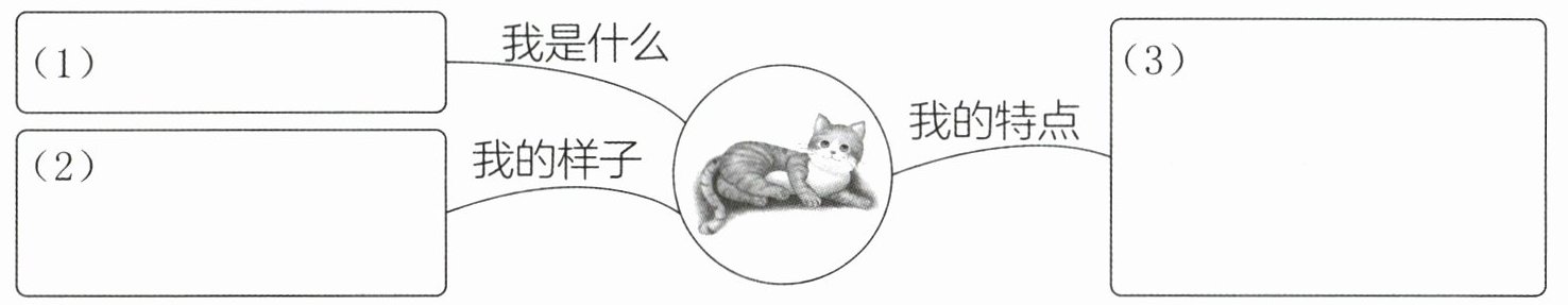 示例:(1)小猫 (2)圆脑袋,长尾巴,全身毛茸茸 (3)爱睡懒觉,好奇心强,追着一根羽毛也能玩很久