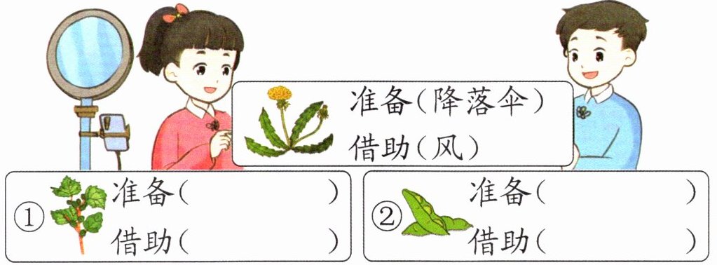 四、照样子,为大家介绍下面的植物是怎么传播种子的。