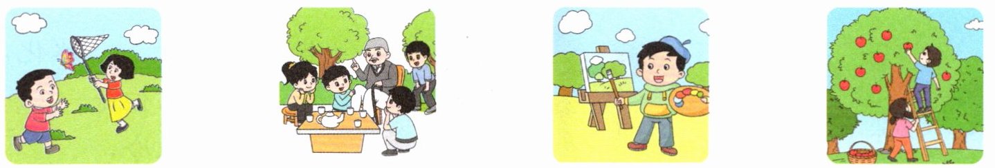 2. 草地上捉蝴蝶 大树下听故事 空地上画画 果园里摘果子