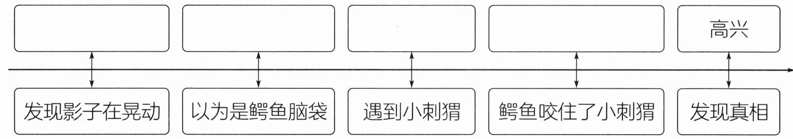 1. B 解析:根据第①自然段“小兔沿着雪白的墙根走在回家的路上。突然,他发现墙根那儿有个影子在晃动,他感到忐忑不安”可知,小兔最初发现可怕影子的地点是在回家的路上,雪白的墙根处。2. 示例:原来,那是一个拼装的鳄鱼玩具,小刺猬把玩具鳄鱼的脑袋揪下来,拿回来给小兔看。他们虚惊一场,不由得哈哈大笑起来。3. 示例:原文结局 它给出了意想不到的结局,这种揭示真相的表达使故事充满了趣味性4. 忐忑不安 又怕又急 不再害怕担心