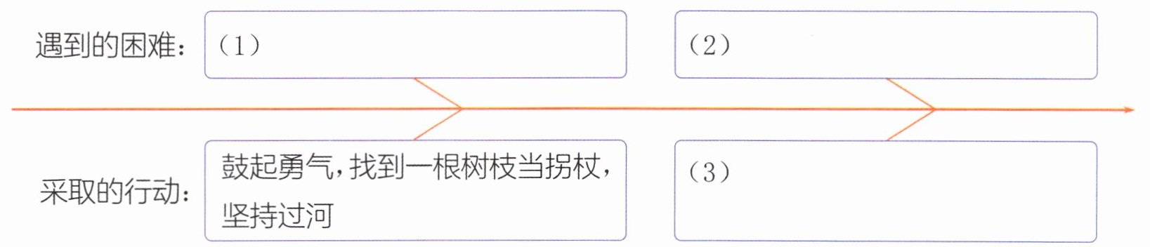 1. 示例:小刺猬吓得站在原地,不敢再往前走了。小刺猬很胆小,害怕新的事物和挑战。 2.(1)河流湍急,不敢过河 (2)森林里阴森恐怖,传来奇怪声音 (3)坚定目标,咬牙前进 3. 示例:河面这么宽,河水这么急,我能过去吗?我会不会被淹死呀?