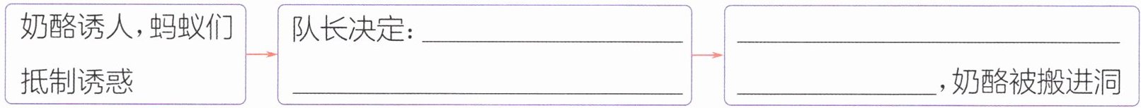 1. 让年龄最小的一只蚂蚁吃掉奶酪渣 大家干劲更足 2. C 3. D 解析:《一块奶酪》这篇课文主要讲的是蚂蚁队长召集小蚂蚁们搬运奶酪时,不小心拽掉了奶酪的一角。最终蚂蚁队长战胜了自己想偷嘴的心理,命令最小的蚂蚁吃掉了奶酪渣。蚂蚁队长能够以身作则,还关爱弱小的同伴。它严于律己、以身作则的作风让大家信服、敬畏,因此,“大家又干起活来了,劲头比刚才更足”。 4. 示例:小蚂蚁们从不同方向迅速地向奶酪所在之处赶来的场景