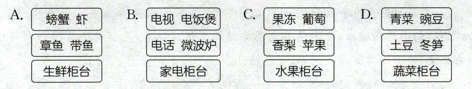 4. 超市的理货员请假了,想请你帮忙整理柜台。下面摆放