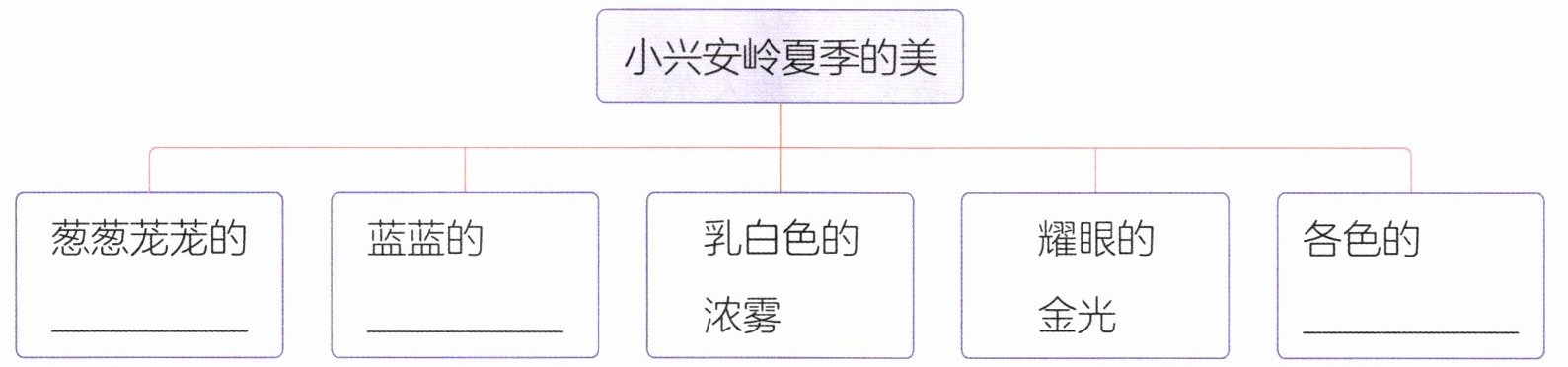 )2. (阅读要素)根据选段内容找关键词句,填一填小兴安岭的夏天美在哪儿。