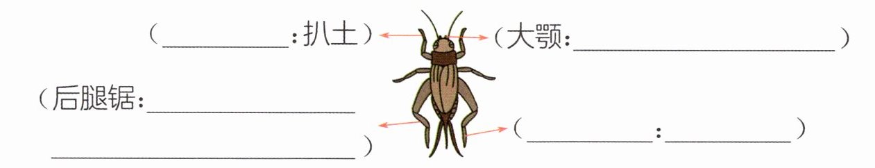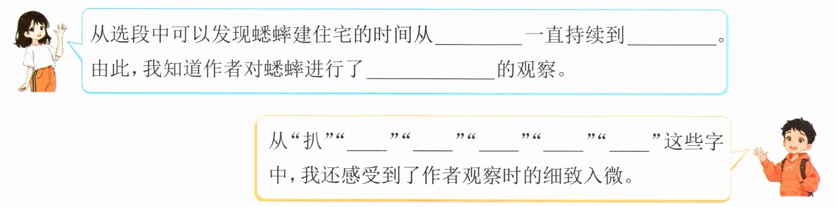 1. 从左至右,从上至下:前足 搬掉较大的土块 将泥土推到后面,倾斜地铺开 后足 踏地 2. 十月 冬天 连续 搬 踏 推 铺 抛 3. B 解析:读第②自然段句子可知,作者一连看了两个钟头,都有些不耐烦了,蟋蟀却一直在不知疲倦地挖掘、建造自己的住宅,通过作者的不耐烦来对比突出蟋蟀在这项工作上的耐心以及它吃苦耐劳的品质。 4. 不能去掉。“大多”表示大部分情况,但不排除特殊情况,体现了语言的准确性。