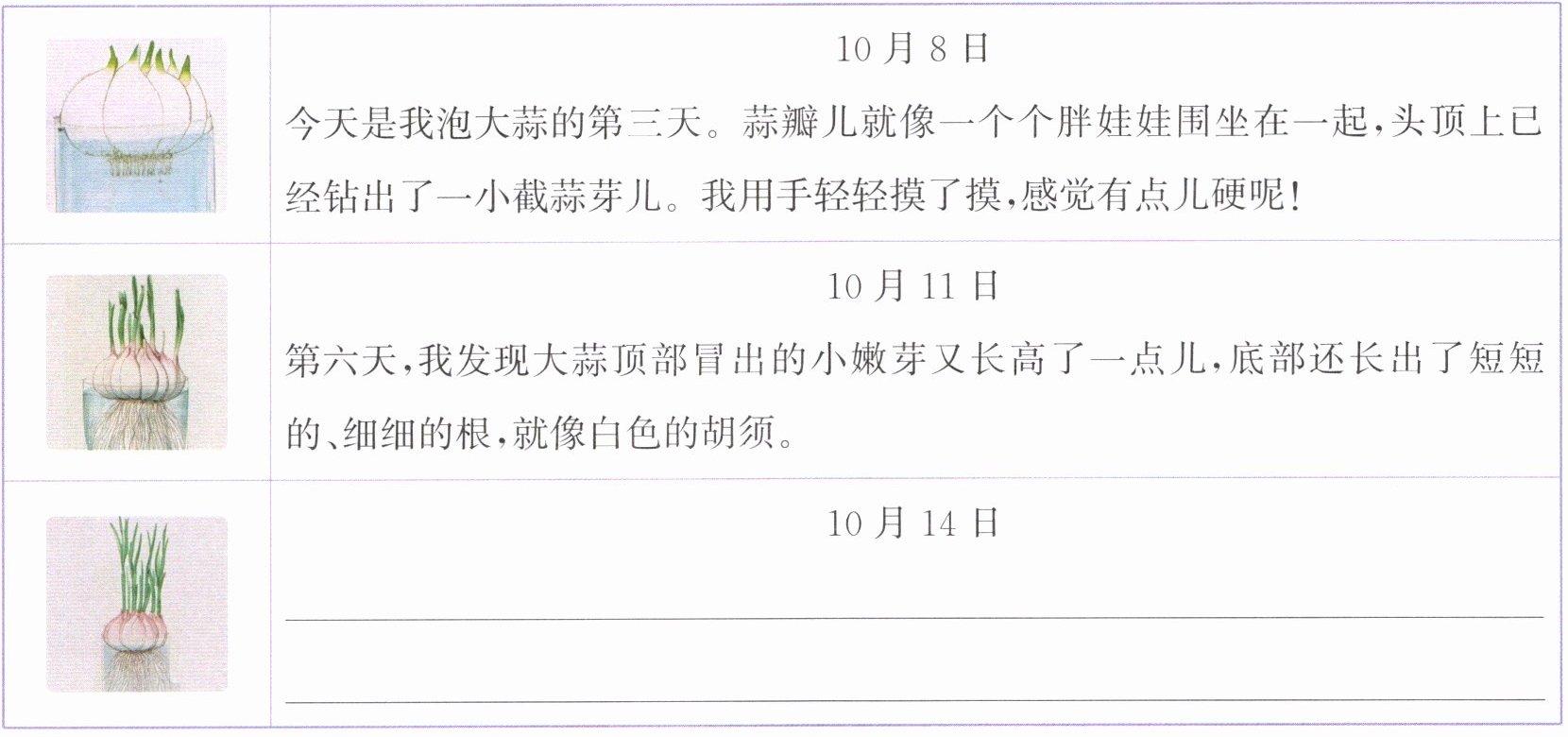 二、[我练表达]阅读下面的观察日记,观察大蒜第九天的变化,把你观察到的和想到的记录下来。