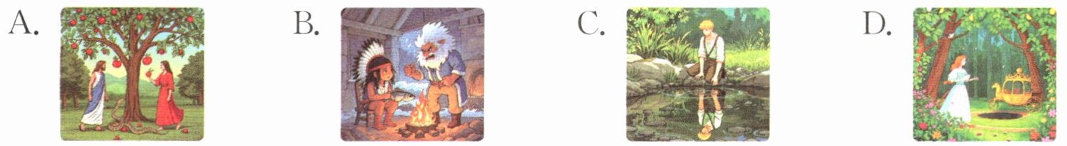 1. B 解析:A 项从一男一女和蛇,可知是亚当与夏娃的故事。B 项漫天大雪,这似乎与北风有一定的联系,因为北风通常与寒冷和冰雪相关。室内一个男人在火堆上烤鱼,对面一个凶男人似乎在威胁着他。这与故事中北风试图通过猛烈的风雪来赶走辛格比,但辛格比用火和乐观的态度应对的情节相匹配。C 项描写的是那喀索斯痴迷于自己的倒影的神话故事。D 项描述的是珀耳塞福涅面前突然出现一辆金色马车的情形,讲的是关于四季的来历的故事。2. B 解析:A 项,宙斯答应保护人类,却没有给人类最重要的东西——火。C 项,赫拉克勒斯不是死于阿波罗之箭。他因误穿了染有毒血的衣服,自焚而死。D 项,文艺女神缪斯不是海神波塞冬的女儿。她是宙斯和记忆女神摩涅莫绪涅的女儿。