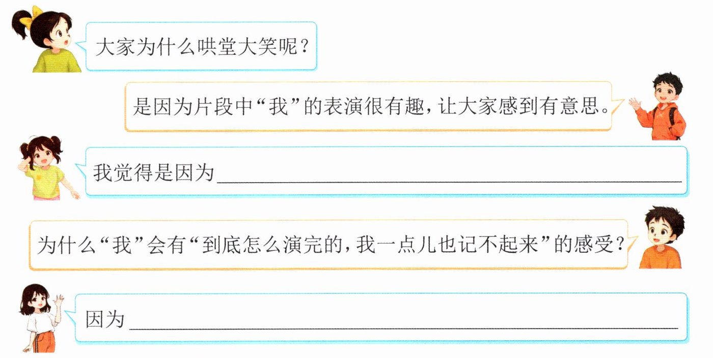 )3. (情境学习)读了课文片段,小朋友们对“我”演大老虎的环节非常感兴趣,纷纷讨论起来,你也加入其中吧!