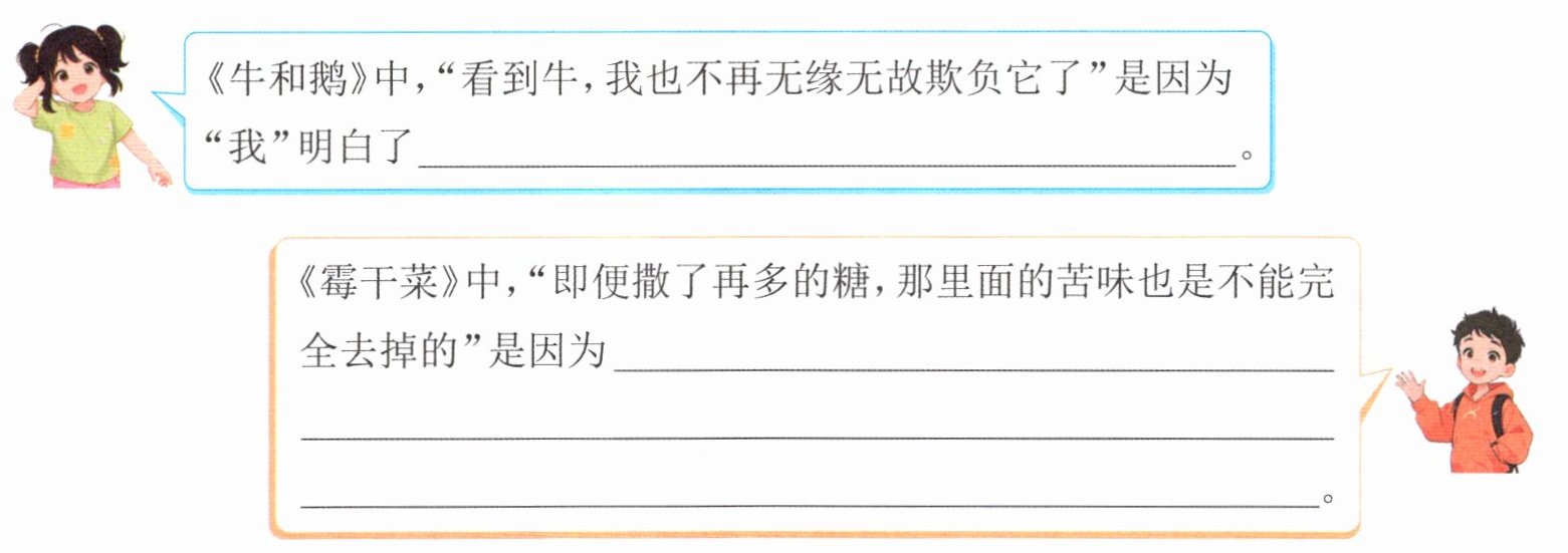 1.(1)看到霉干菜很想吃,却因其有主人不敢拿。(2)紧张害怕 (3)品尝偷来的霉干菜,觉得不好吃。(4)失望不已 2.示例:A 语言 小容既想偷拿霉干菜又有些害怕、自我安慰以及和“我”心有灵犀的心理 3.示例:不矛盾。 因为这次吃到的霉干菜是偷来的,即便滋味如常,但一想到自己和朋友做了不好的事情,作者心中就十分愧疚不安,所以才总能品出苦味,这与霉干菜本身的滋味是不冲突的。 4.示例:要尊重每一个生命,不要随意欺负弱小 偷拿霉干菜这件事是错误的,给“我们”带来了愧疚和不安,这种不好的感觉无法完全消除,就像霉干菜里的苦味无法完全去掉一样