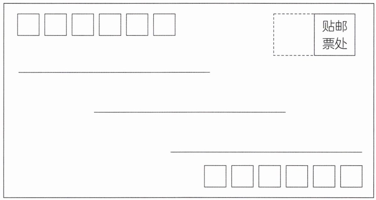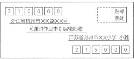 二、[书信练习]江苏省苏州市××小学(邮编 215000)的小鑫同学想给《课时作业本》编辑部写一封信,但忘记了信封书写的格式,请你帮他写好信封。《课时作业本》编辑部的地址:浙江省杭州市××路××号,邮编 310000。