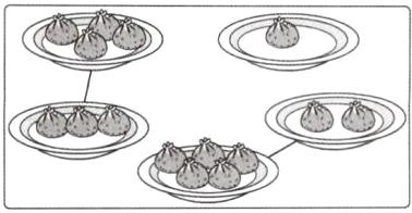 3. (地域美食)生煎是苏州的传统小吃,拥有百年历史。某顾客点了7个生煎,请将下面的生煎选两盘连一连。