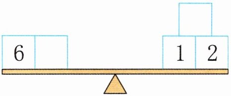 答案不唯一,如 1 4 解析:先算出跷跷板右边$1 + 2 = 3$,左边比右边多$6 - 3 = 3$。要在跷跷板的两边各添上一个数,使左右两边的和相等,那么左边添加的数比右边添加的数少 3 就可以了,如左边添上 1,右边添上 4。